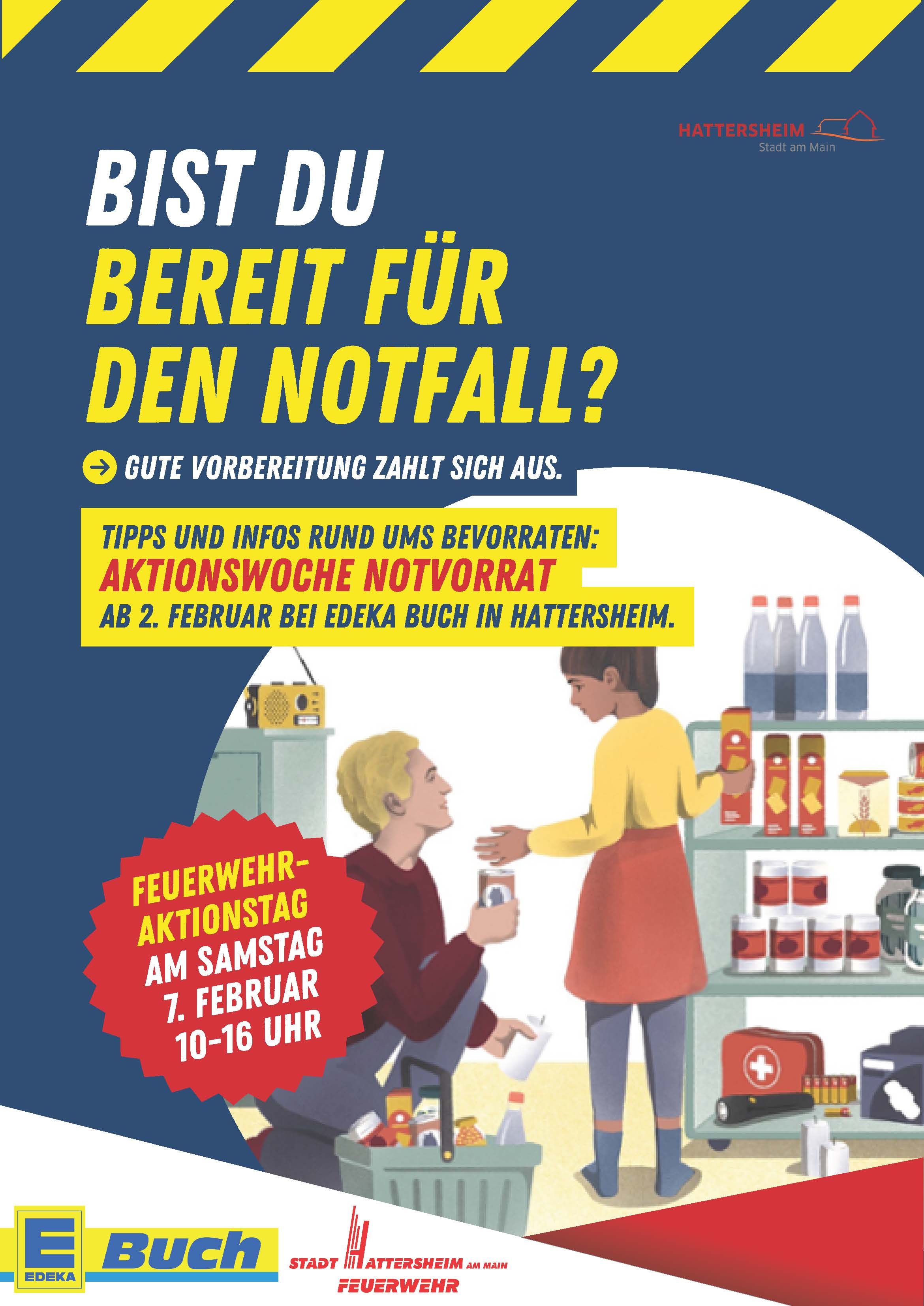 Wie gut bin ich auf einen Stromausfall, ein Unwetter oder eine andere Krise vorbereitet? Diese Frage steht im Zentrum der Aktionswoche von EDEKA Buch, den Feuerwehren und dem Referat Brand- und Bevölkerungsschutz der Stadt Hattersheim am Main. Die Aktion läuft vom 2. bis 13. Februar 2026 im EDEKA-Markt in Hattersheim und ist Teil der städtischen Kampagne „Bist Du bereit für den Notfall?“.